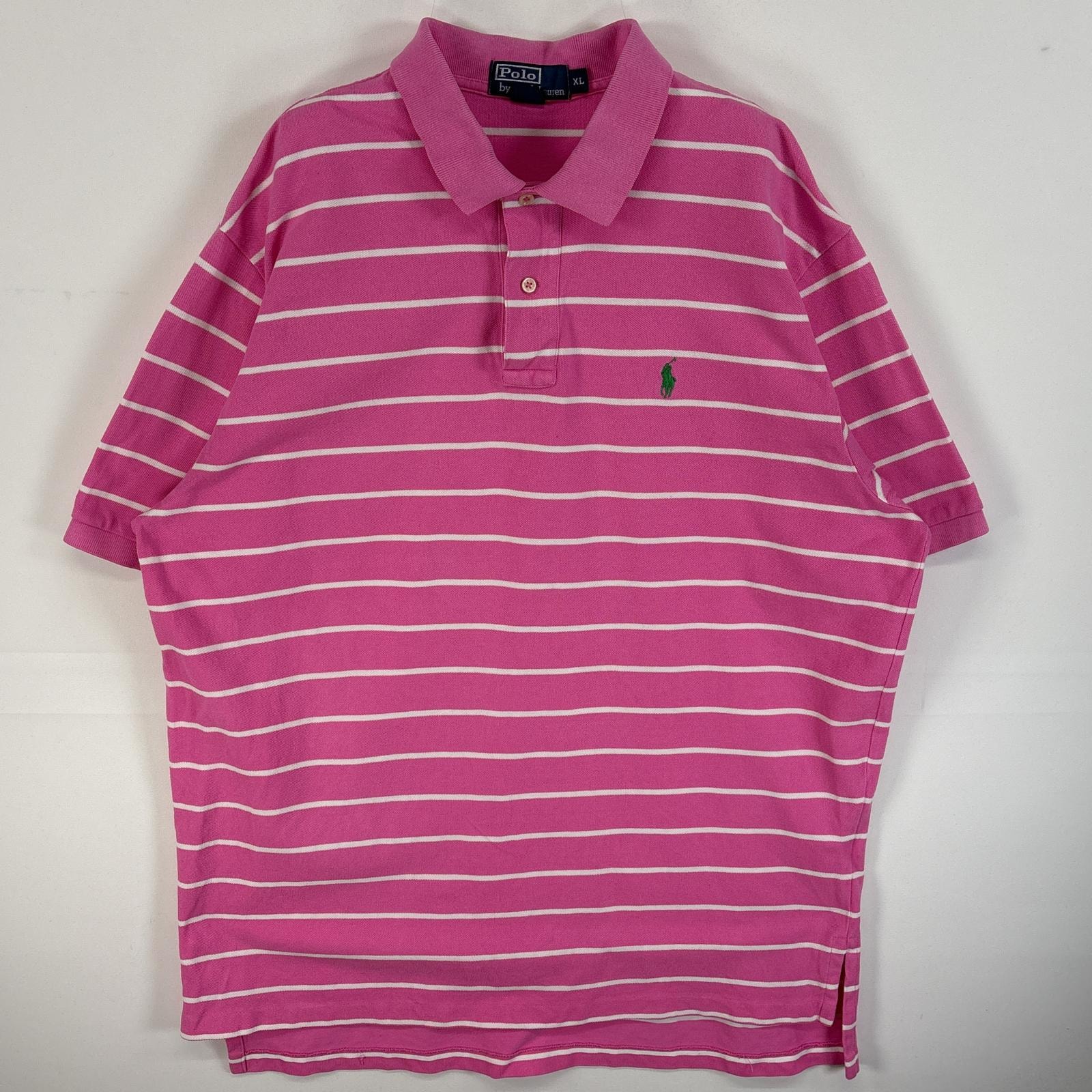古着 90's/90年代 ポロバイラルフローレン Polo by Ralph Lauren 鹿の子 半袖 ポロシャツ ロゴ 刺繍 大きいサイズ 2ボタン XL ピンク系 ボーダー メンズ