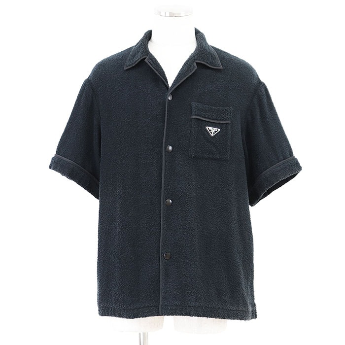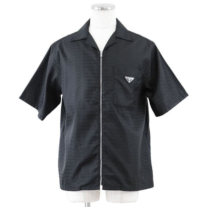 美品 プラダ リナイロン 半袖 ショートスリーブトライアングル 三角 プレート オープンカラー 半袖シャツ メンズ ブラック M PRADA