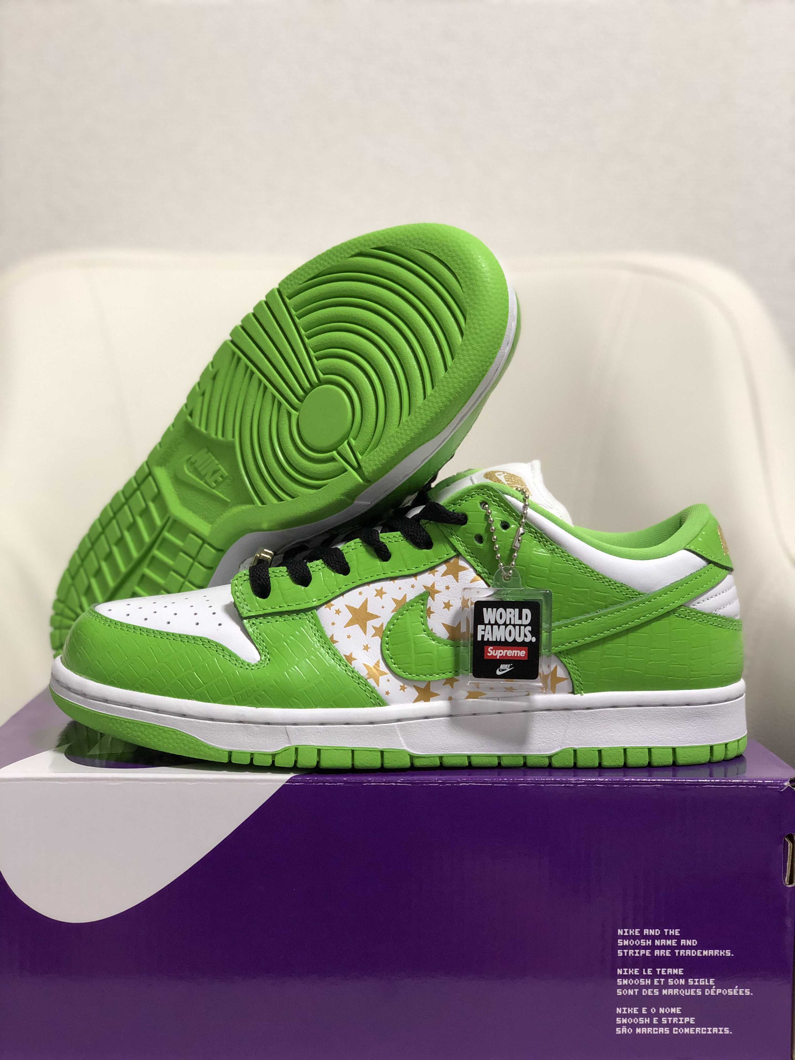 Supreme × Nike SB Dunk Low OG QS Gold Stars "White/Mean Green"