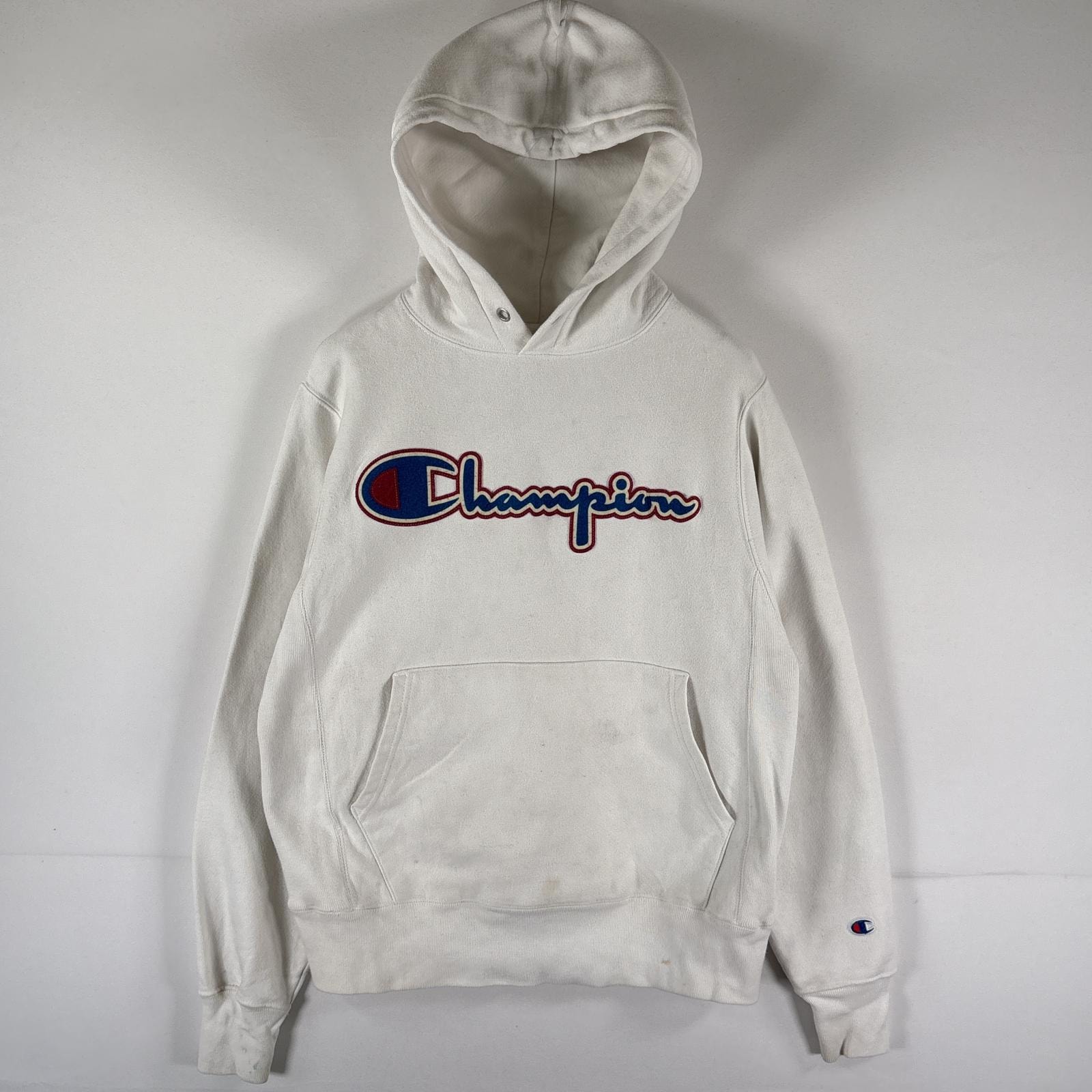 古着 チャンピオン Champion パーカー リバースウィーブ プルオーバー フーディ スウェット ワッペン ビッグロゴ SMALL ホワイト メンズ