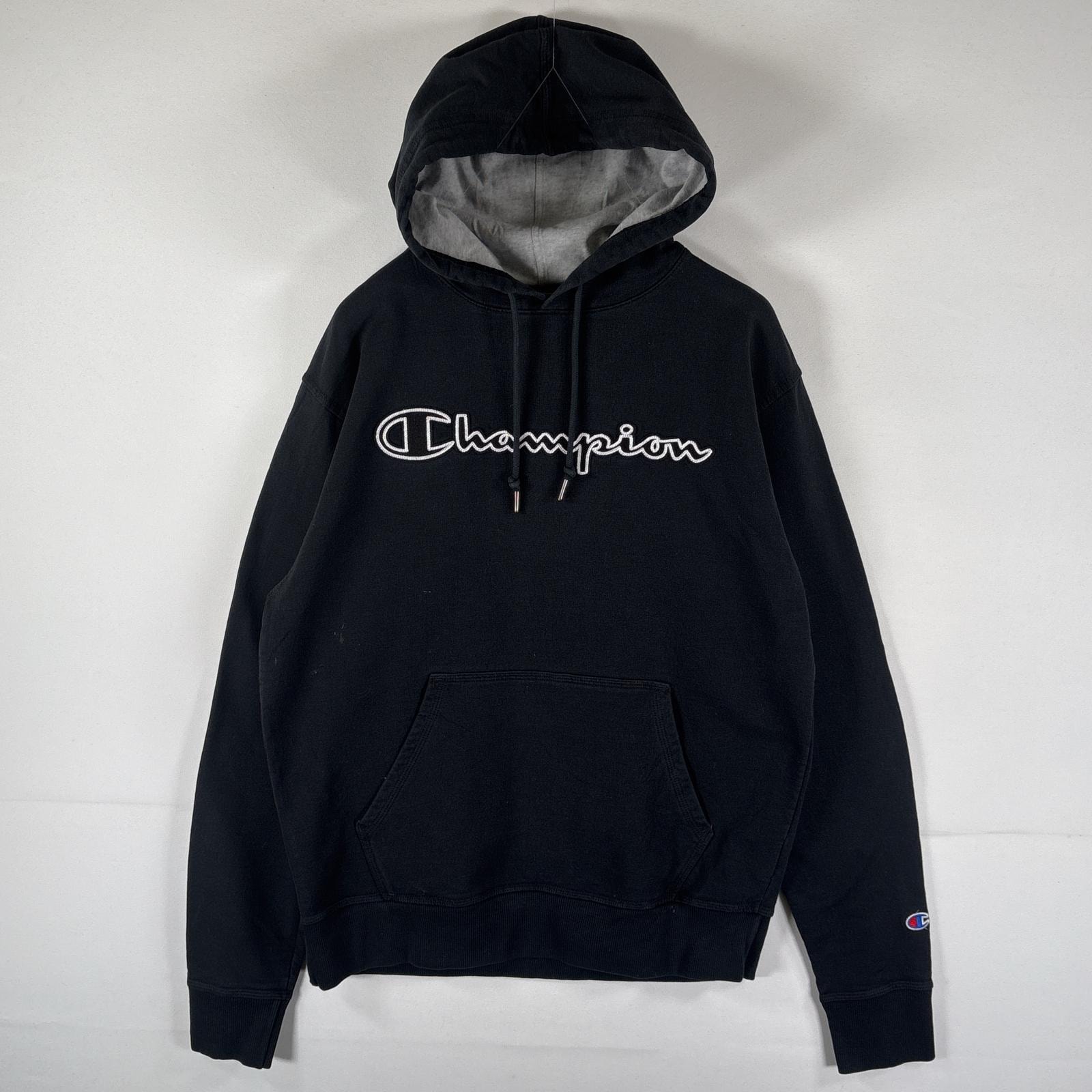 古着 チャンピオン Champion パーカー スウェット 大きいサイズ ビッグロゴプリント ワッペン フーディ XL ブラック メンズ