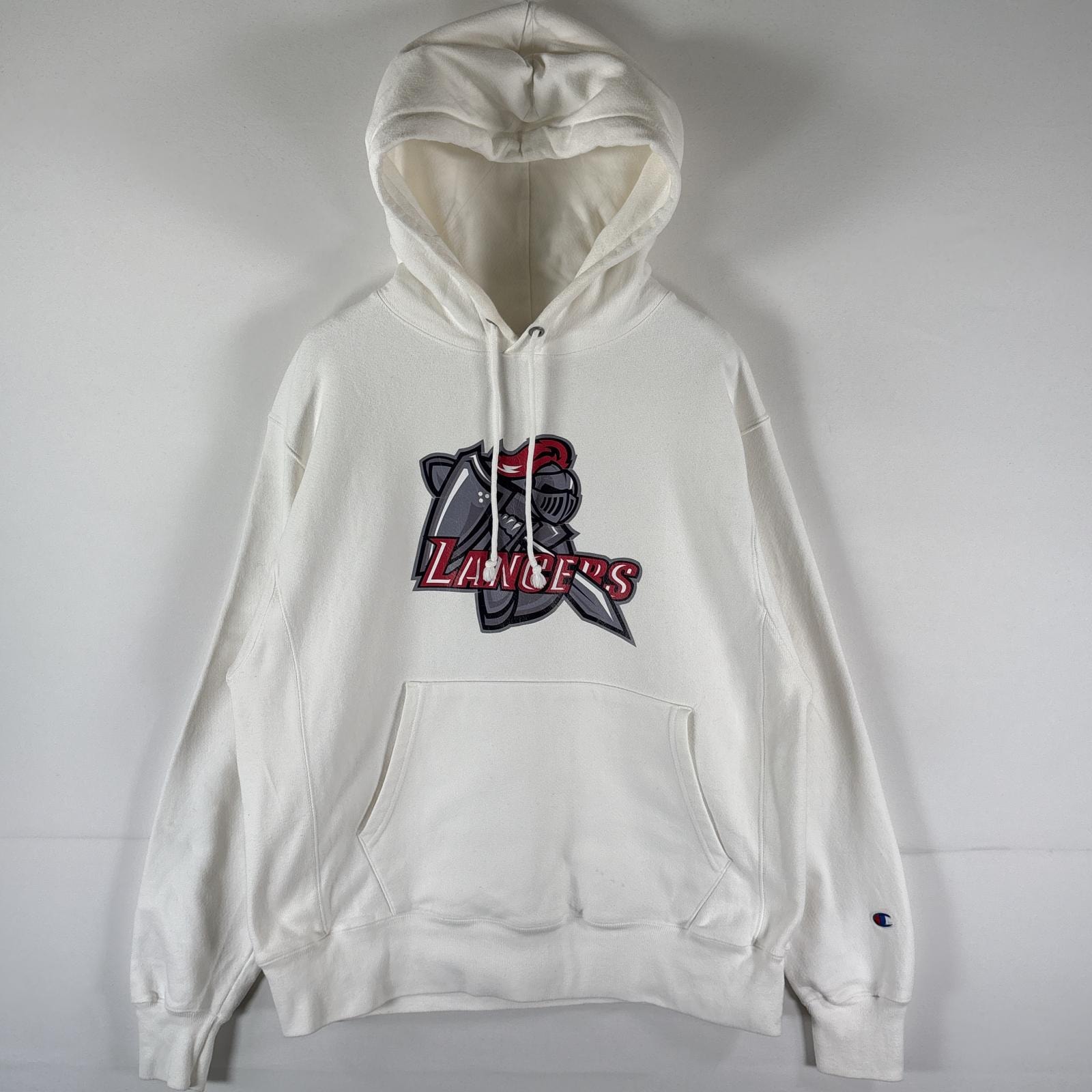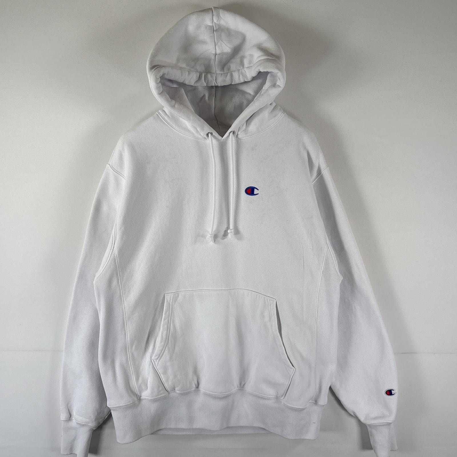 古着 チャンピオン Champion パーカー リバースウィーブ プルオーバー フーディ スウェット ワンポイントロゴ刺繍 LARGE ホワイト メンズ