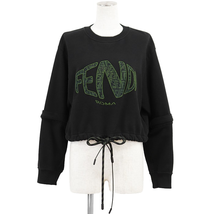 SALE【美品】FENDI フェンディ クロップドスウェット サイズ XS レディース シグネチャー ロゴ メッシュ × エンブロイダリー 刺繍 短丈 2WAY デタッチャブルスリーブ ドローコード トレーナー トップス ブラック グリーン 黒 緑 イタリア製