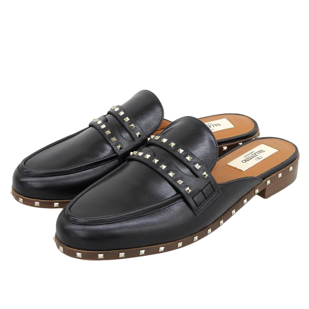ヴァレンティノガラヴァーニ 新品同様 レザーソール ロックスタッズ フラット ミュール シューズ レディース 黒 36 36