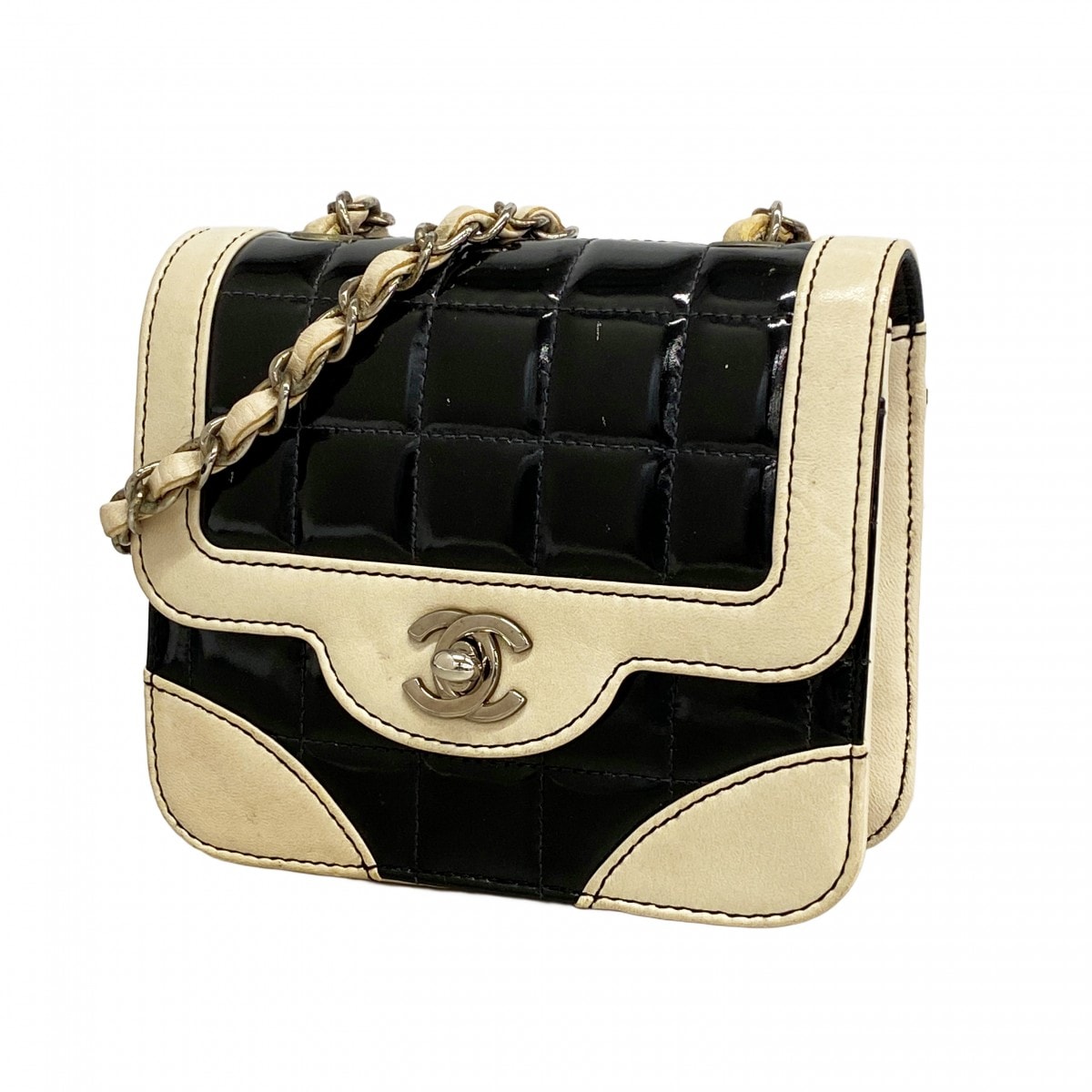 ★SALE【6db2064-k】シャネル ショルダーバッグ チョコバー チェーンショルダー レザー パテントレザー ブラック ホワイト シルバー金具【中古】レディース