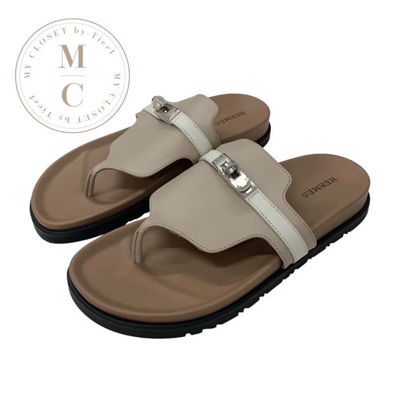 エルメス HERMES アンピール サンダル 靴 シューズ レザー ブラウン ホワイト 未使用 ケリー金具 ミュール フラット トング