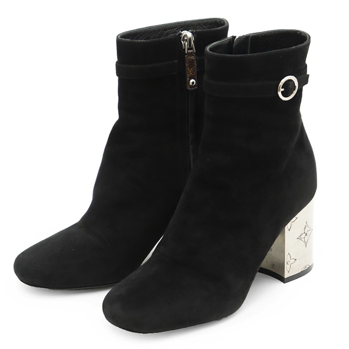 SALE【美品】LOUIS VUITTON ルイ・ヴィトン アンクルブーツ サイズ 35 1/2 レディース 2022年製 メタルモノグラムフラワーヒール スウェード シューズ 靴 ブラック シルバー 黒 銀色 イタリア製