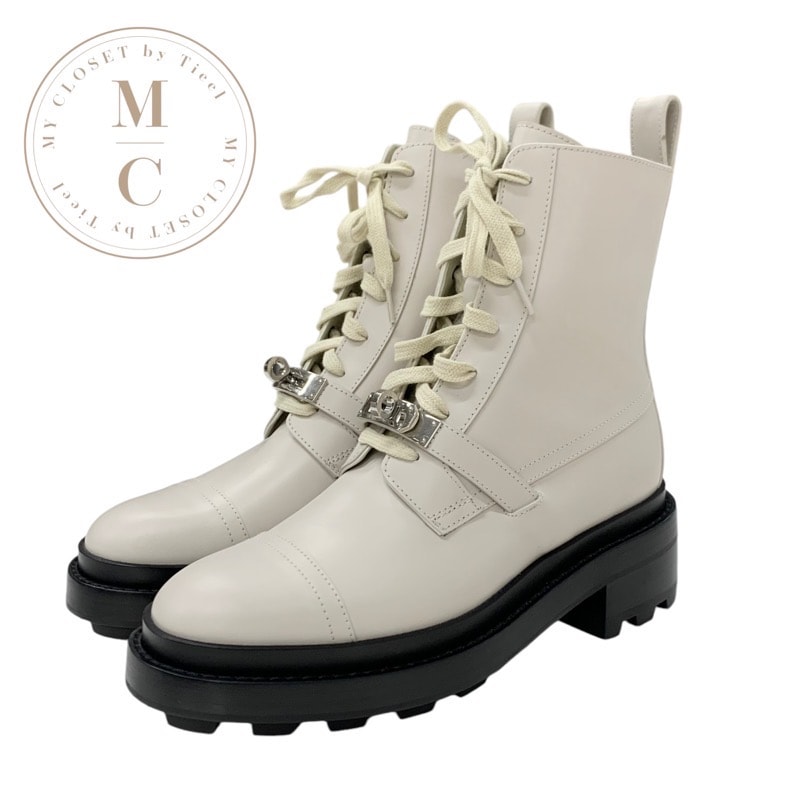 エルメス HERMES ファンク ブーツ ショートブーツ 靴 シューズ レザー アイボリー シルバー ケリー金具 レースアップ