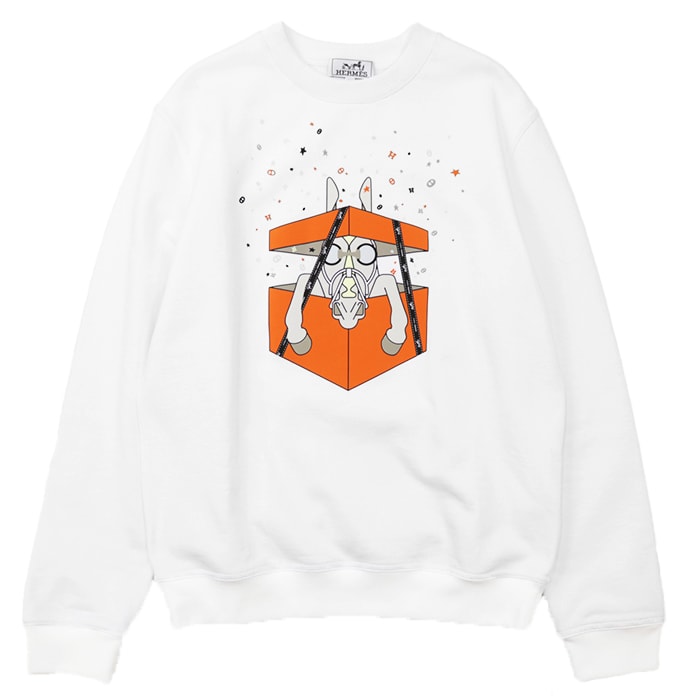 【美品】HERMES エルメス スウェット サイズ M メンズ 24SS Boite Surprise ボワット・シュルプリーズ ホース プリント クルーネック フリース トレーナー 長袖 ロングスリーブ トップス タグ付属 ホワイト 白 イタリア製