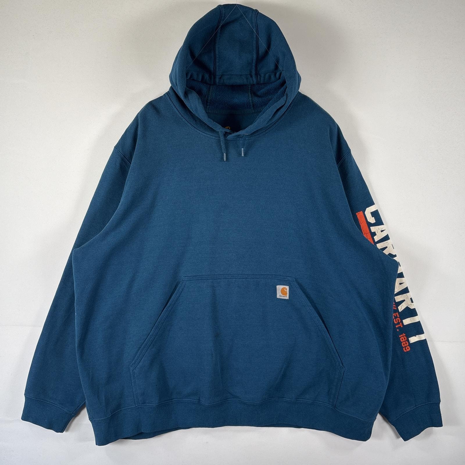 古着 カーハート Carhartt パーカー スウェット プルオーバー 袖ロゴ フーディ 大きいサイズ 14042 ブルー系 メンズ